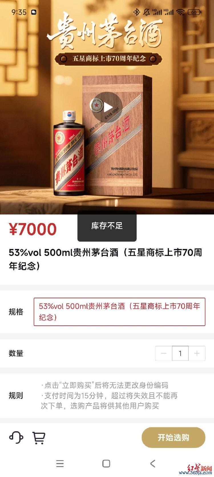 红星老本局8月8日音尘,本日上昼9时,贵州茅台(600519.SH)酒(五星商标上市70周年驰念)上架i茅台APP,限量25568瓶,单瓶售价7000元开云体育,有多个年份款秒售罄。在本轮抢购启动前,已有黄牛在一又友圈教导“拼手速,涨价三位数红包收购”。现在,部分日历的五星驰念酒在二手平台转售价达到上万元。